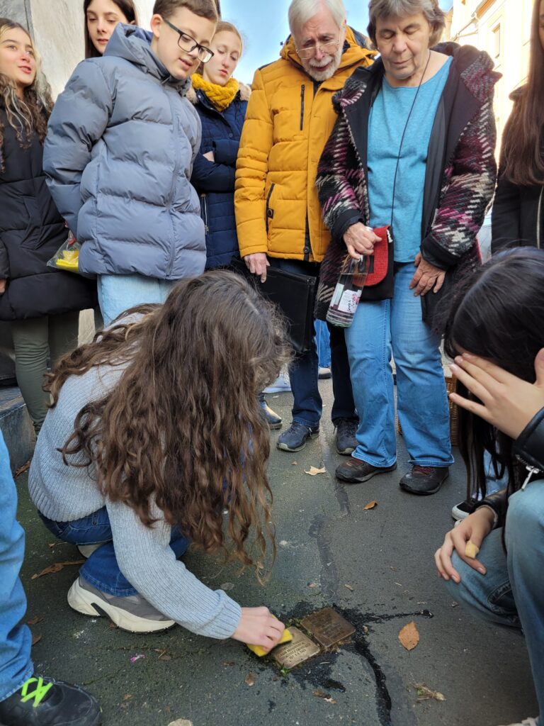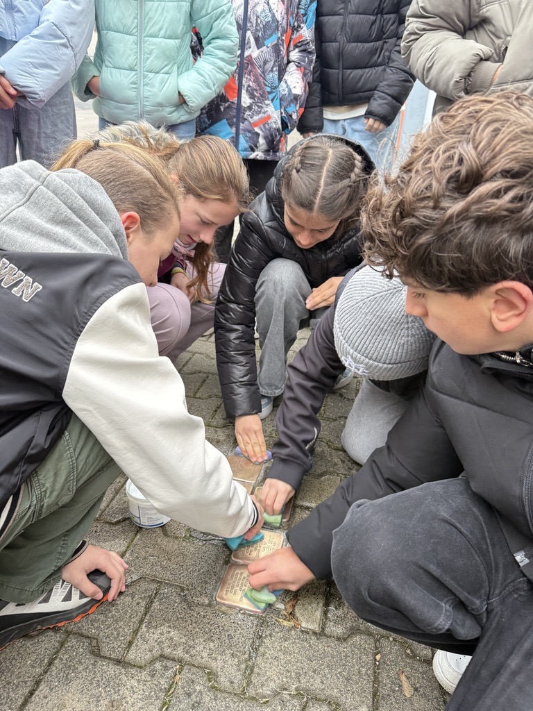 Der letzte Stolperstein ist geputzt. Fast. Ein Junge holt die Wasserflasche aus dem Korb von Ursula Oelke, das Wasser spült die Putzmittelreste vom Stein, ein Mädchen bringt ihn mit einem Tuch zum Glänzen. Jetzt sieht er nicht mehr aus wie eine Straßenmarkierung.