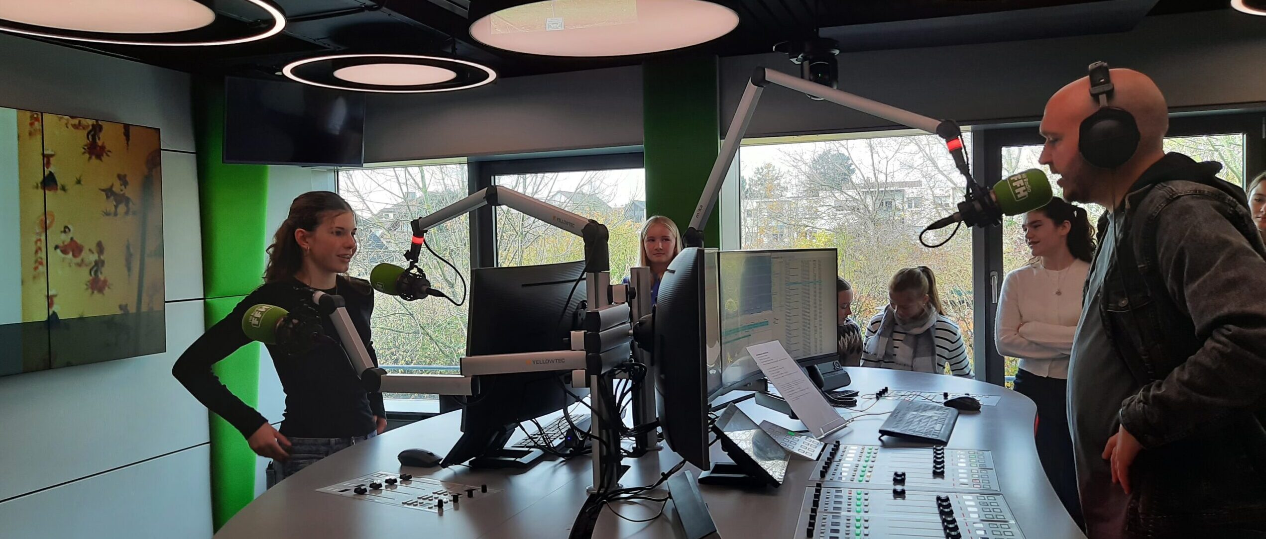 Bei einer Führung erfuhr die Klasse viel über die Arbeit des Radiosenders, der als erster privater Radiosender in Hessen 1989 sein Programm mit aktueller Chart- und Popmusik startete. Die Jugendlichen bekamen die verschiedenen Regler, Knöpfe und technischen Geräte im Studio erklärt und durften auch einige ausprobieren. Bei einem Rundgang durch die verschiedenen Abteilungen erfuhren sie, wie die Musik ausgewählt wird, wie Nachrichten und Unterhaltungsbeiträge produziert werden und dass zum Sender auch „Planet Radio“ und das 80-er Radio „Harmony“ gehören. Außerdem konnten sie den Planet-Radio-Moderatoren Sarah und Patrick durch die gläsernen Studiowände beim Aufnehmen zusehen.