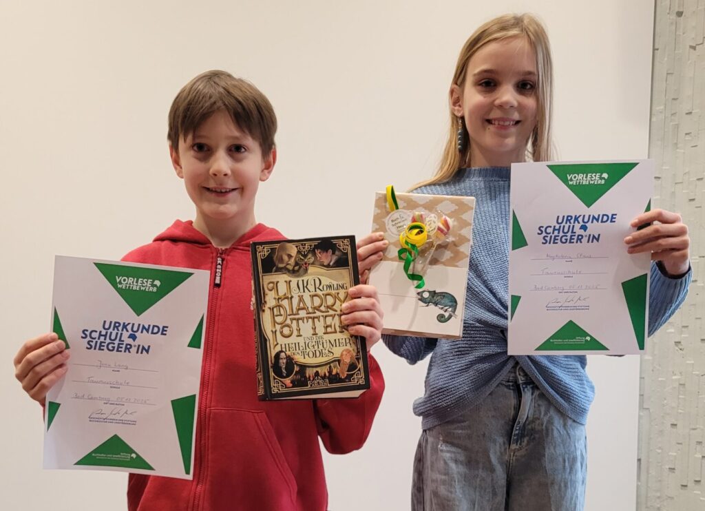 Magdalena Claus (G6a) und Jona Lang (F6c) haben den Vorlesewettbewerb der sechsten Klassen an der Taunusschule gewonnen. „Harry Potter“ führte beide zum Sieg: Magdalena (Siegerin des G-Zweigs) begeisterte die Zuhörer mit ihrem Vortrag aus dem Buch „Harry Potter und der Stein der Weisen“. Jona (Sieger der Förderstufe) las eine Stelle aus „Harry Potter und die Heiligtümer des Todes“ vor.
