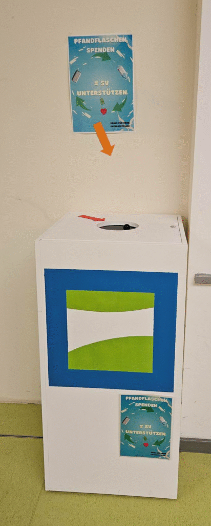 Damit die Aktion starten konnte, hat Herr Jahn aus vorhandenem Material eine Sammelbox für Pfandflaschen gebaut. Die Box steht in der Cafeteria an der rechten Wand und ist deutlich gekennzeichnet. Dort können Schülerinnen und Schüler sowie Lehrkräfte ihre leeren Pfandflaschen einfach einwerfen.