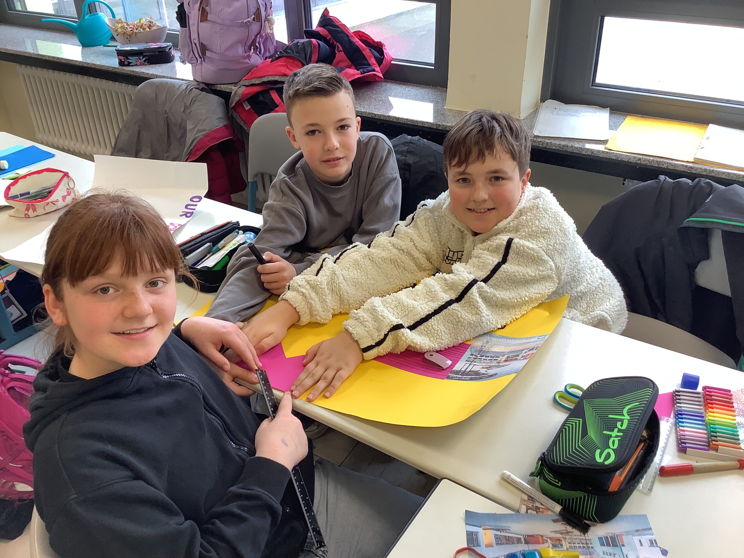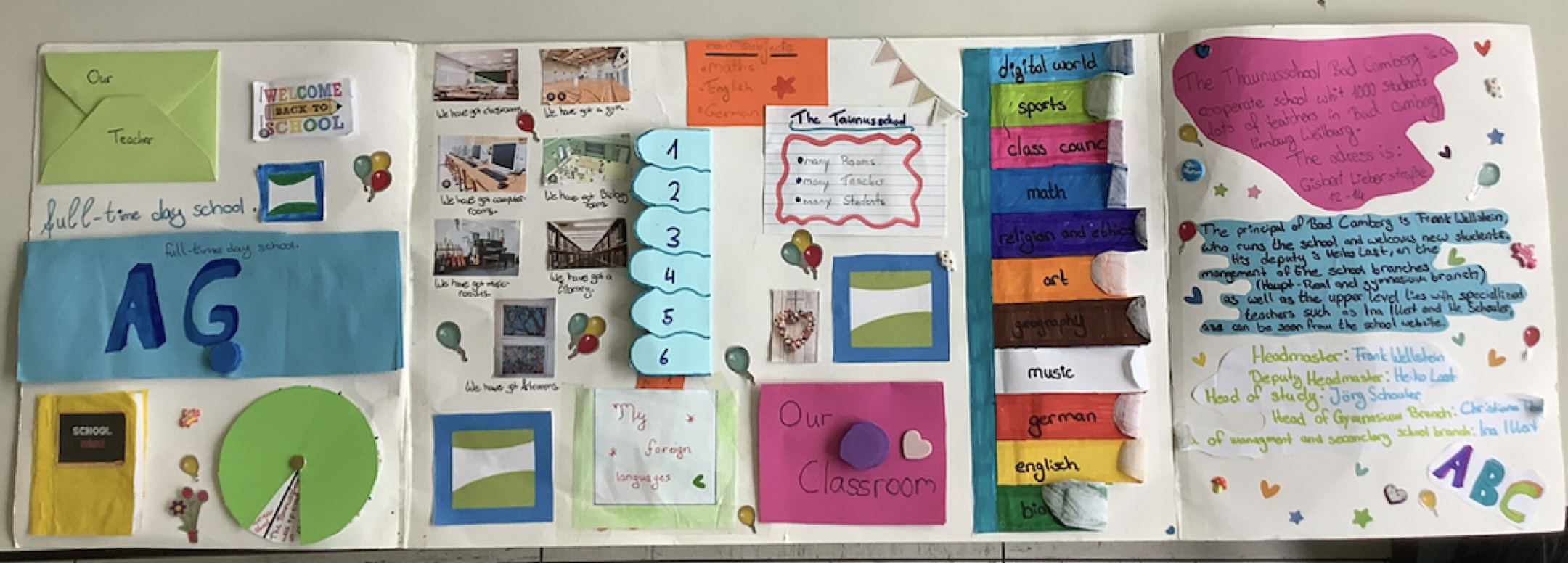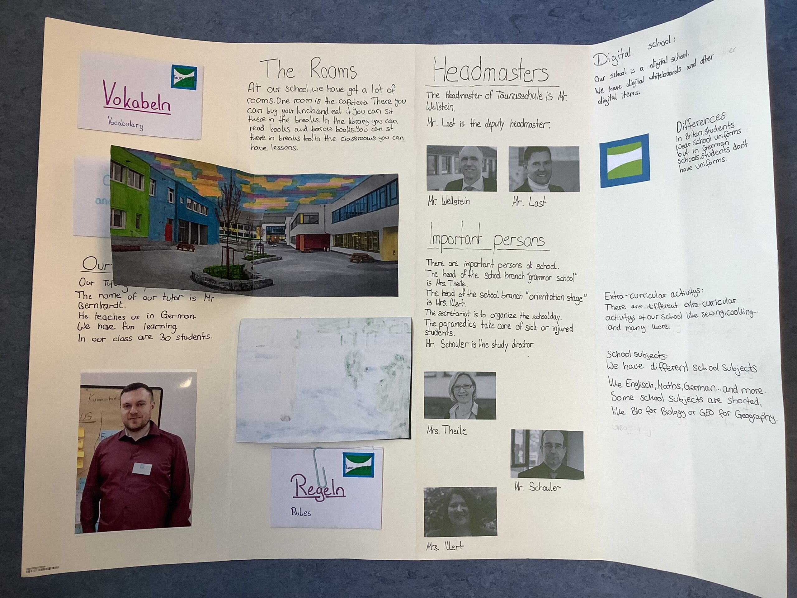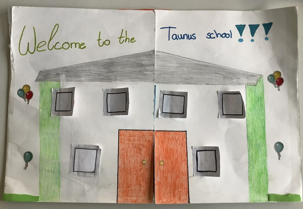 Nein, das ist kein Quiz. Doch diesen und ähnlichen Fragen hat sich die Klasse 5Gb gemeinsam mit ihrer Englischlehrerin Frau Felkl nach gut einem halben Jahr an der Taunusschule gewidmet und ihre neue Schule in einem Englischprojekt vorgestellt. Hierbei konnten sich die Schülerinnen und Schüler das zu erstellende Produkt und die Arbeitsweise selbst aussuchen. Sie hatten die Wahl zwischen einer Broschüre, einem Lapbook und einem klassischen Poster und konnten alleine, zu zweit oder auch in einer kleinen Gruppe arbeiten. Diese Wahlmöglichkeiten gefielen der Gruppe, wie Marie bestätigt: