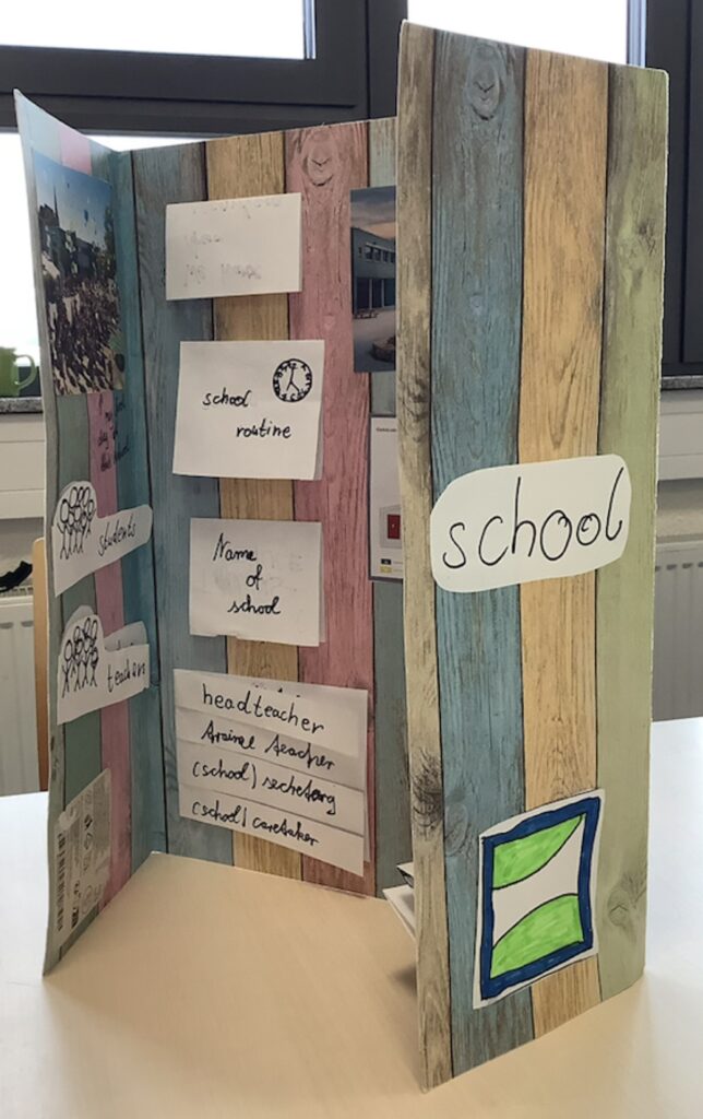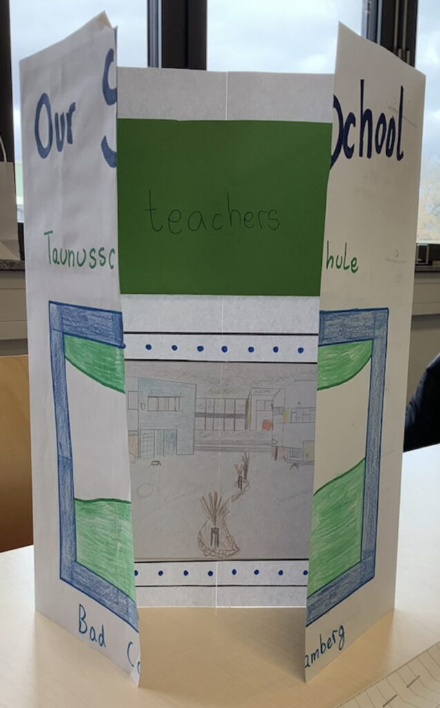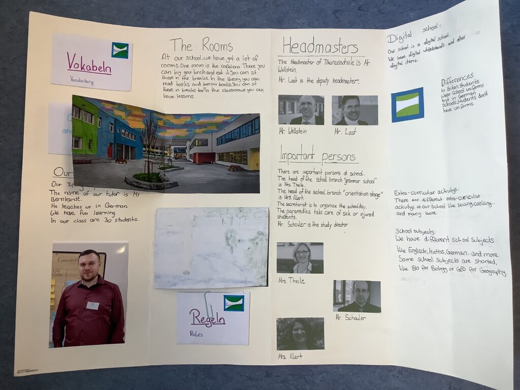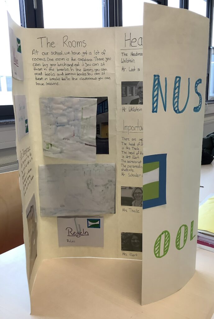 Natürlich sollten die Produkte auf Englisch gestaltet werden. Dabei konnten die Schülerinnen und Schüler das bisher Gelernte vertiefen und erweitern. Für die Taunusschul-Regeln beispielsweise nutzten sie den vor kurzem gelernten Imperativ oder Satzstrukturen mit „can“ bzw. „can’t“. Um das Gebäude zu beschreiben, konnten sie „There is / are“ oder „We have got / haven’t got“ verwenden. Der Wortschatz über „Schule“ wurde umgewälzt und viele neue Vokabeln wurden gelernt. Hierbei zeigten die Schülerinnen und Schüler sehr großes Interesse.